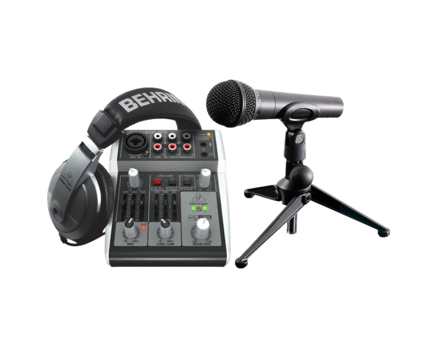 The Behringer Podcastudio 2 is a complete hardware bundle featuring a Xenyx 302USB mixer, Ultravoice XM8500 dynamic microphone, HPM1000 headphones, and essential accessories. Designed for podcasting, streaming, and home recording, it provides a ready-to-use solution for professional-quality audio production.