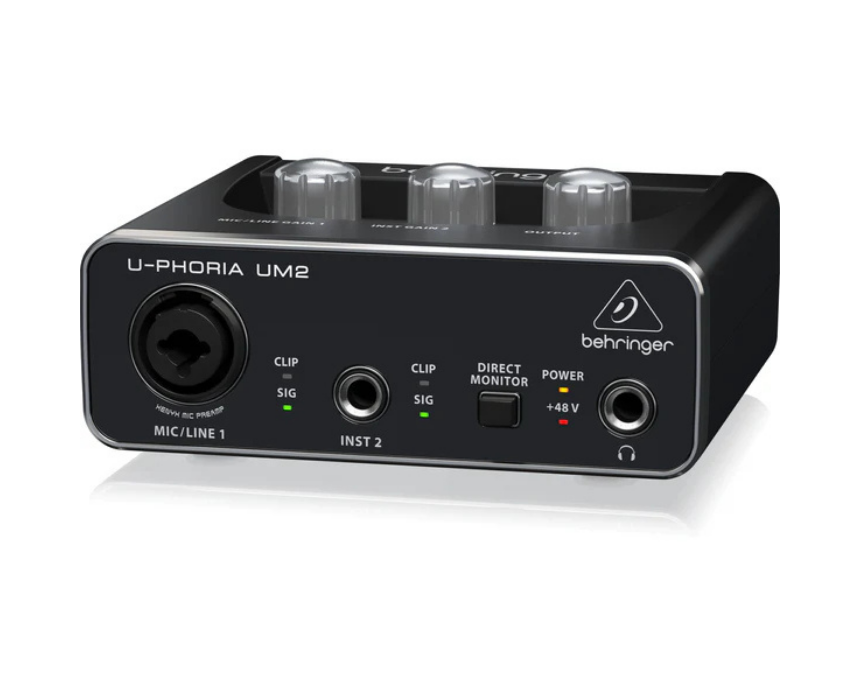 The Behringer U-Phoria UM2 is a 2-channel USB audio interface with 48kHz resolution, one XENYX preamp, phantom power, and an instrument input. Ideal for home studios, podcasting, and music production, it provides reliable, high-quality recording and playback.