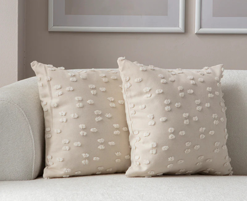 The Beige Textured Knot-Dot Cushion features soft woven fabric with raised knot-dot detailing, adding tactile interest and subtle elegance to sofas, beds, or accent chairs. Its neutral beige tone complements boho, modern, or minimalist décor styles. Pair it with patterned or solid cushions to create a layered, cozy, and stylish look in any living space.