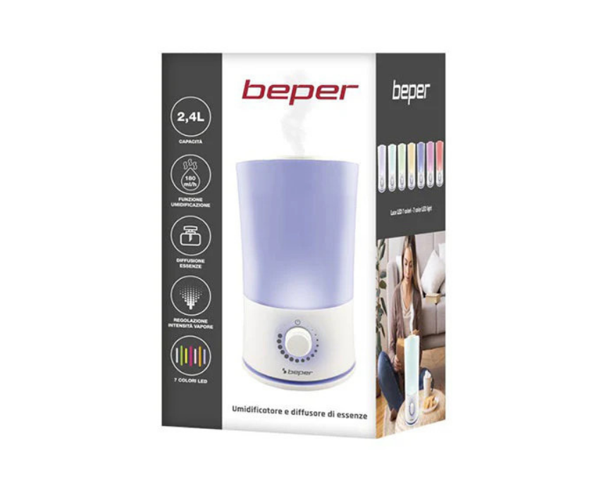 <p>This humidifier and aroma diffuser features a classic design with an ultrasonic atomizer and seven color LED lights with continuous chromatic variation. It includes a knob to adjust cold mist output, an ON OFF switch, and automatic shut off when the water runs out. With a mist output of 180 ml/h and a 2.4 L water tank, it provides effective humidification and a soothing aromatic atmosphere.</p>