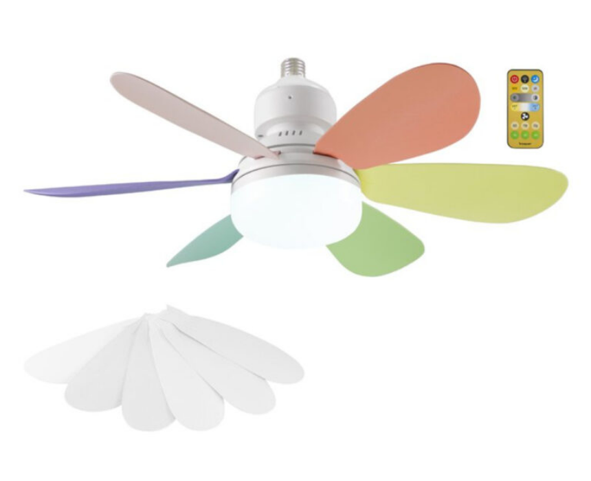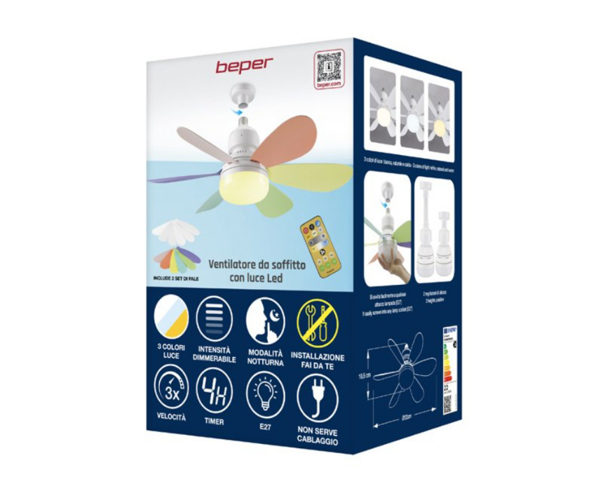 <p>This ceiling fan combines efficient ventilation and adjustable lighting in one elegant solution, making it ideal for homes, offices, and garages. It features three ventilation speeds, silent operation, a programmable timer, interchangeable white and colored blades, and an energy saving E27 lamp with adjustable brightness, three light tones, and night light function, all conveniently controlled by the included remote.</p>