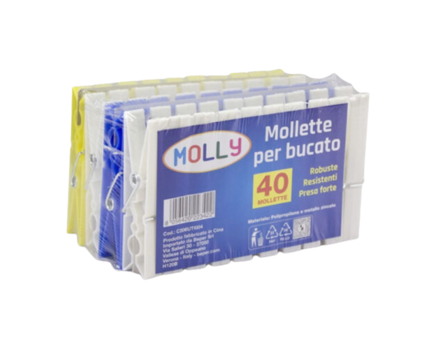 <p>This set includes 40 high quality plastic clothes pegs with strong iron springs in yellow white and blue. Made from hard sturdy plastic, the pegs provide reliable grip to prevent clothes and sheets from falling during daily use. Ideal for drying racks and clotheslines, they are designed to withstand repeated use while ensuring secure and efficient drying. Weight 100 g.</p>