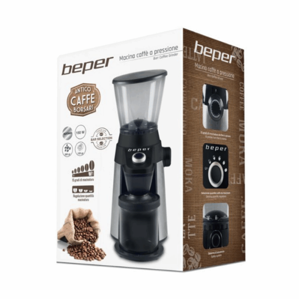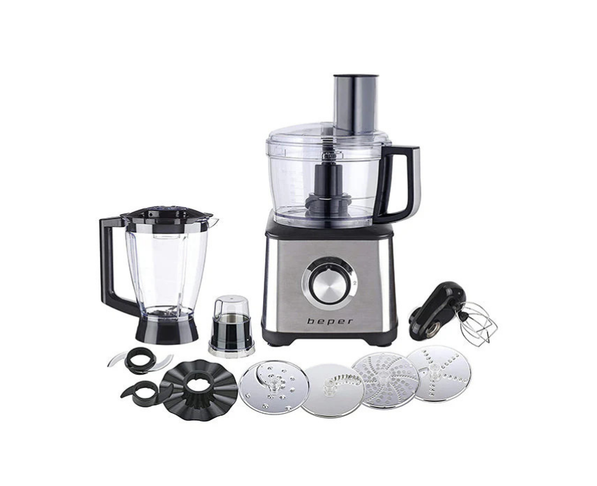 <p>This Beper food processor features a steel and ABS body and comes with multiple accessories including a 400ml coffee grinder, 1.75L plastic blender with filter, 1.2L container with steel blades for mincing, plastic knives for dough, whisk, emulsion disc, and 5 stainless steel discs for different types of cutting. It has a plastic lid with a slit for adding ingredients during processing, 2 speed levels plus pulse function, and stable non slip feet for secure operation.</p>