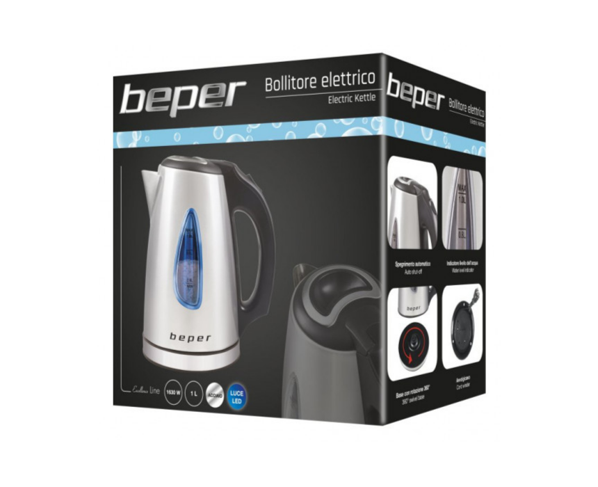 <p>This practical wireless electric kettle is ideal for serving hot drinks comfortably at the table, featuring a 1 liter stainless steel carafe with concealed heating elements for greater hygiene. It includes a removable filter, graduated water level indicator, blue operating light and automatic shutdown when the temperature is reached or when no water is present. The base is equipped with a cable winder and a convenient power button is located on the handle.</p>