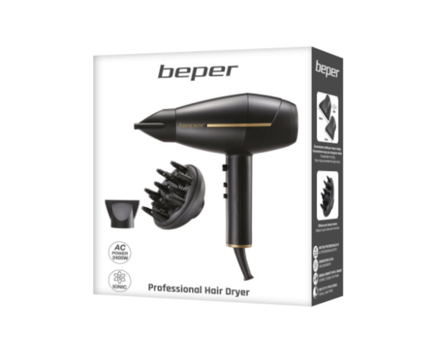 <p>This professional hair dryer features a powerful AC motor in a compact modern design with two selectable speeds, three temperature levels, and a cold air blow button for long lasting styles. The ionic function helps reduce static electricity while enhancing shine, and styling is made easy with two air concentrators and a diffuser. Designed for safe and efficient use, it includes overheating protection and a removable rear grille for easy cleaning.</p>
