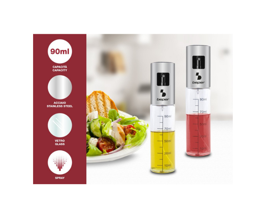 <p>The Beper Oil Sprayer is made of glass and steel with a transparent graduated container for precise and light seasoning. Ideal for cooking and air fryer use, it allows controlled oil spraying instead of brushing and can also be used with vinegar lemon juice soy sauce or water. With a 90 ml capacity, it measures 4×18.5 cm and is perfect for healthier everyday cooking.</p>