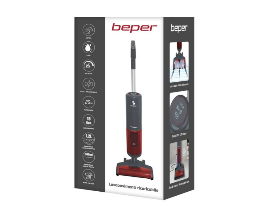 <p>This rechargeable floor cleaner quickly removes liquid and solid dirt while vacuuming and washing floors simultaneously. It works with any floor detergent automatically releases solution for fast drying and features an LED display with battery level and two selectable speeds. Equipped with a roll brush HEPA filters two tanks for clean and dirty water self cleaning function and cleaning accessories it charges in 3 hours for about 25 minutes of use. The cleaner measures 27x27x102 cm and weighs 4.5 kg.</p>