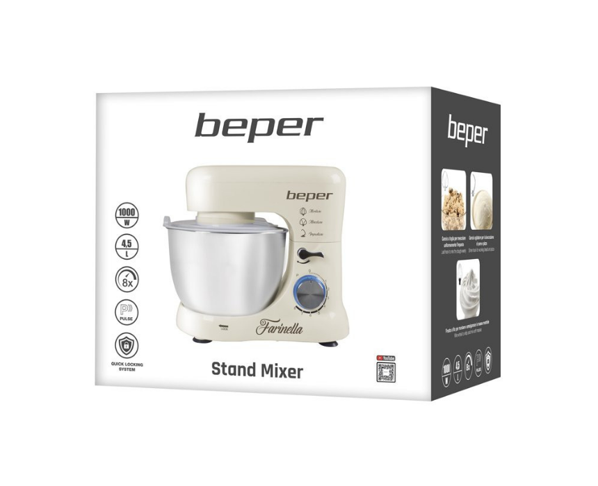<p>This Beper stand mixer features planetary rotation where the forks rotate around their own axis and along the edge of the 4.5L removable stainless steel bowl to push dough inward. With a powerful 1000 watt motor and 8 speeds plus a selectable pulse button it is ideal for kneading mixing and whipping. Includes wire whisk leaf hook and dough hook with a transparent splash guard and non slip suction cups for maximum stability.</p>