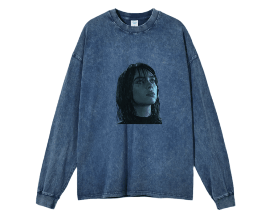 This acid wash long sleeve shirt is crafted from 270 GSM 100 percent cotton with DTG printed artwork inspired by Billie Eilish’s Hit Me Hard and Soft. Designed by Geesplug, it delivers a premium feel and a bold textured look.