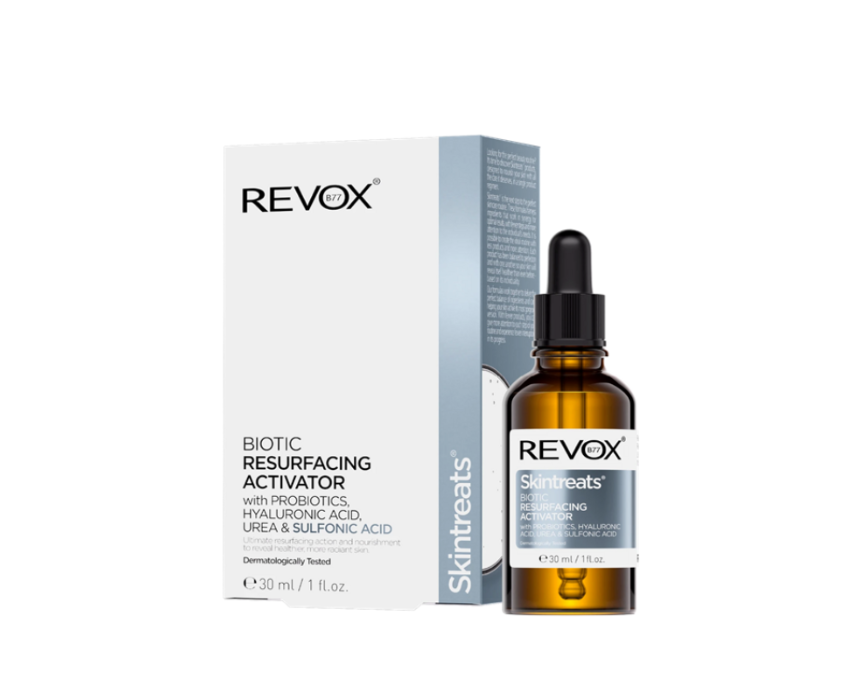Revox Biotic Resurfacing Activator is a dual-action serum that gently exfoliates, rehydrates, and nourishes the skin for a smoother, more radiant complexion. Its formula combines an exfoliating sulfonic acid with urea, hyaluronic acid, and kombucha probiotic to renew texture, support moisture balance, and improve skin appearance. Apply a few drops to clean face and neck morning or evening for soft, refreshed, and healthy-looking skin.