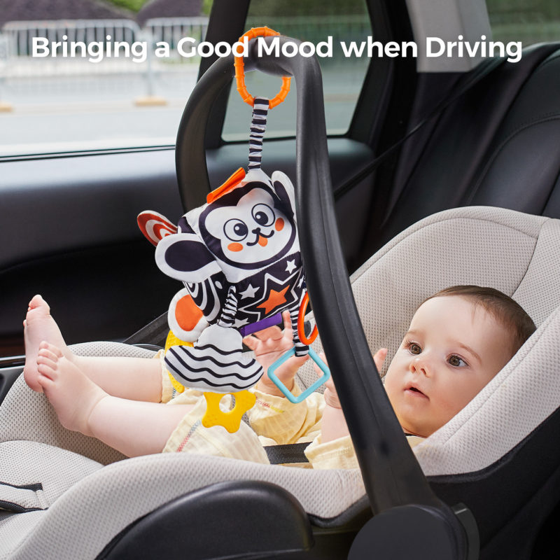 This baby sensory cube toy is perfect for both indoor and outdoor play, easily attachable to strollers and crib mobiles. Featuring bright colors, black-and-white patterns, hanging teethers, and funny animal faces, it keeps infants engaged and entertained. Each of the six sides offers unique textures, prints, and sounds, including a built-in rattle and crinkle paper for sensory stimulation. Made from high-quality, washable plush that maintains its shape, with rounded, safe teethers and elastic pull strings for easy grabbing. Recommended for newborns and up.