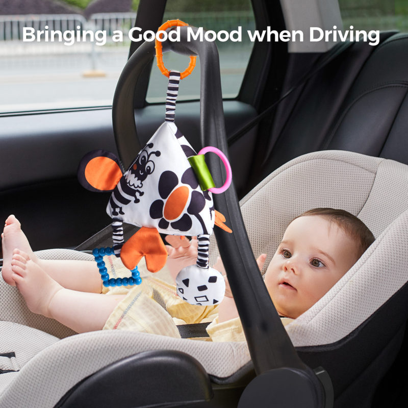 This baby sensory pyramid toy is designed for both indoor and outdoor fun, easily attachable to strollers and crib mobiles. Featuring bright colors, black-and-white patterns, hanging teethers, and funny animal faces, it keeps infants visually stimulated and entertained. Each of its four sides offers unique textures, prints, and sounds, including a built-in rattle and crinkle paper for sensory engagement. Made from high-quality, washable plush that retains its shape, it includes safe rounded teethers and elastic pull strings for easy grasping. Recommended for newborns and up.