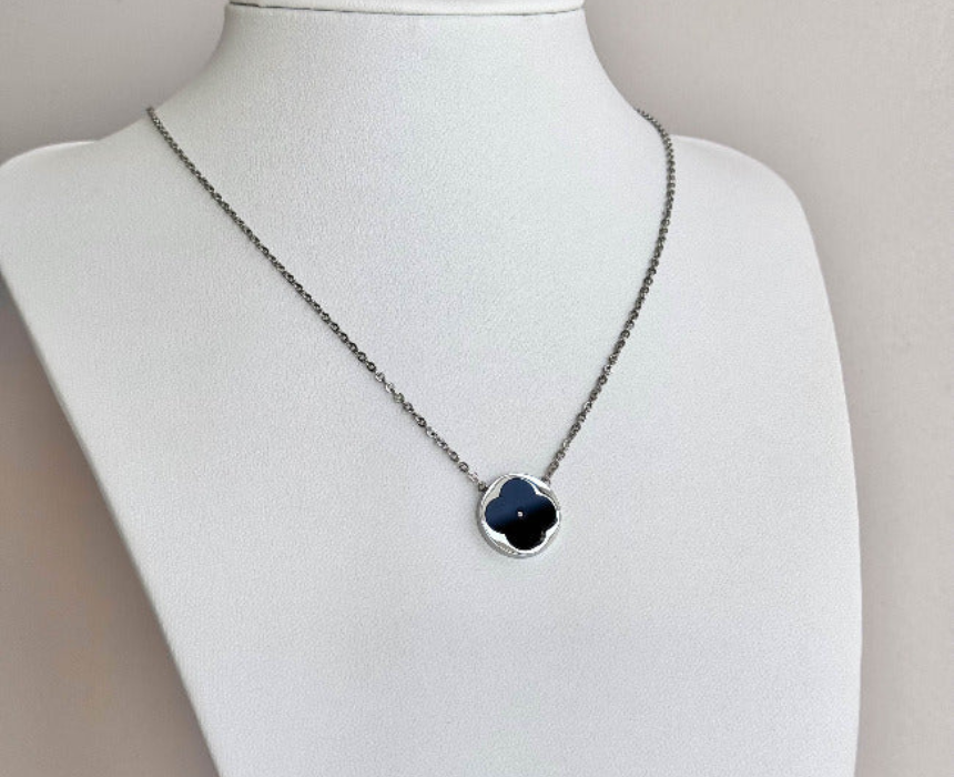 This black clover necklace features a sleek pendant design that symbolizes luck and elegance, adding a refined touch to any jewelry collection. Designed for everyday wear, it can be styled alone for a subtle statement or layered with other necklaces for a trendy, modern look. Its versatile aesthetic complements both casual outfits and more polished ensembles effortlessly