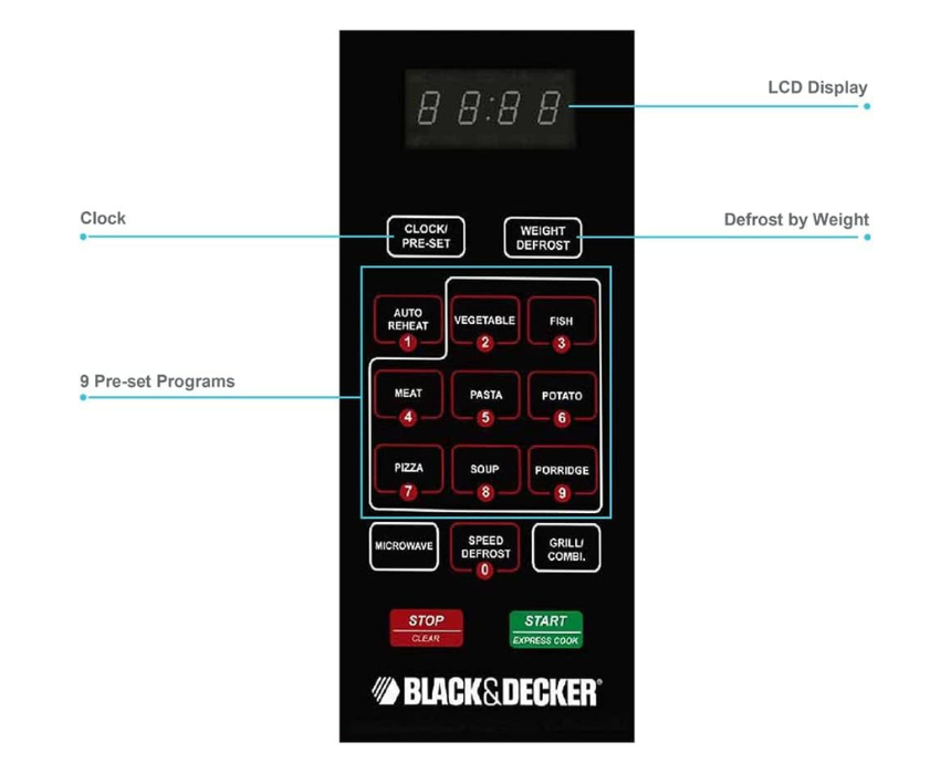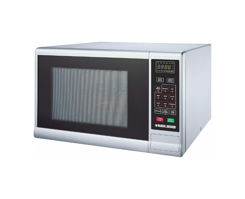 The BLACK+DECKER 30L Microwave offers 1000W of powerful performance with five power levels, grill and defrost functions, and an Auto Menu for effortless cooking. Its spacious 30L capacity, even heat distribution and sleek silver metal finish make it ideal for family meals and modern kitchens. Perfect for daily use; choose your preferred setting for quick heating, grilling or defrosting.