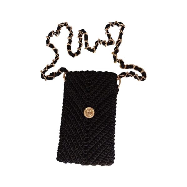 Sparkle as you protect your phone with our black glittery hand-crocheted mobile cover. Meticulously crafted from premium yarns infused with subtle glitter, this elegant accessory provides a soft yet durable shield for your device. Designed with a universal fit, it comfortably accommodates all mobile sizes while maintaining a lightweight, festive profile. The sophisticated golden chain allows for easy crossbody carrying, making it the perfect statement piece.