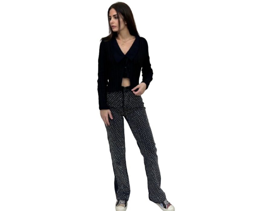 These women’s jeans feature a sleek denim finish enhanced with subtle glitter detailing for a modern, eye catching look. Designed with a flattering full length fit, they offer comfort while maintaining a structured silhouette. Style them with a simple top and heels or boots to balance casual denim with a touch of shine.