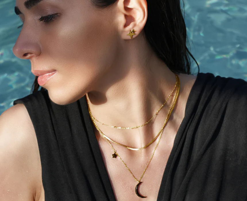 Black Moon Necklace features a sleek celestial inspired pendant that adds a subtle and modern touch to everyday styling. Designed for versatility, it pairs easily with casual outfits or layered looks for a more refined aesthetic. Wear it alone as a minimal statement piece or combine it with other necklaces to create a personalized and contemporary layered style.