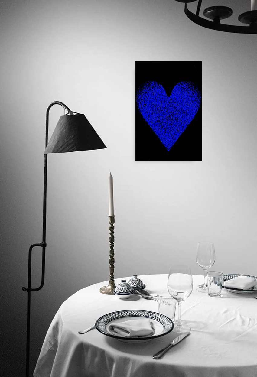 Add a touch of classic intensity to your walls with the Black & Royal Blue heart shape digital print canvas. Measuring 45x30cm, this artwork features a vibrant royal blue heart set against a deep black canvas. The digital printing process ensures the blue remains bold and saturated, offering a sophisticated look for modern interiors. Perfect for adding a pop of color to a professional or personal space. Please check specs before ordering as this includes the canvas only.