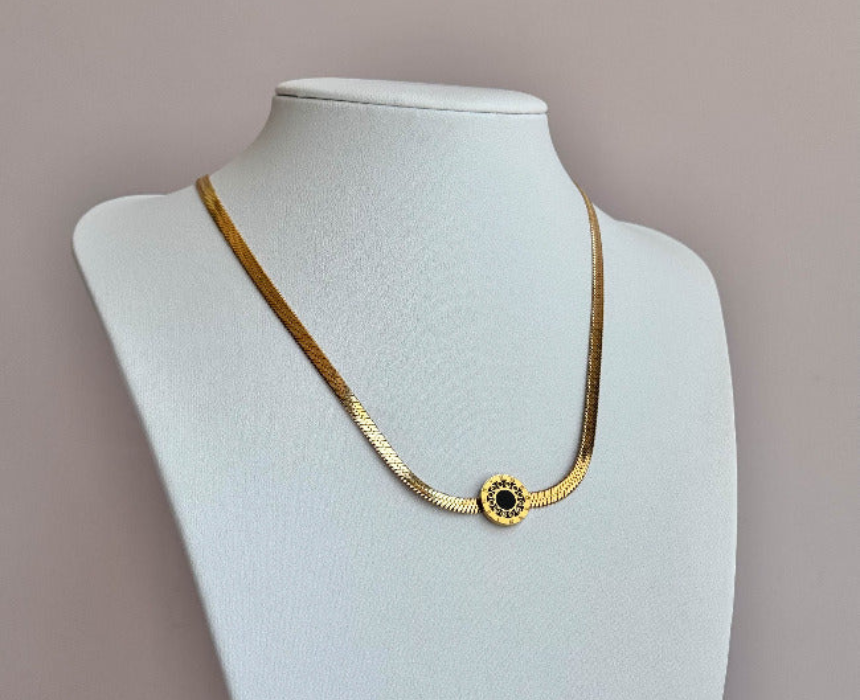 The Black Stone Necklace features a striking dark stone pendant set in a sleek design, offering a bold and elegant accessory for any outfit. Its versatile style complements both casual and formal looks, adding a touch of sophistication. It can be worn alone for a statement piece or layered with other necklaces for a modern and fashionable effect