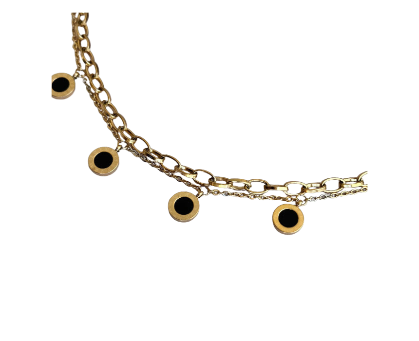 This black stones bracelet features elegant dark gemstones set in a sleek design, adding a sophisticated and versatile touch to any jewelry collection. Ideal for everyday wear, it can be worn alone for a subtle statement or stacked with other bracelets for a modern layered look. Its stylish design complements both casual outfits and more polished ensembles effortlessly.