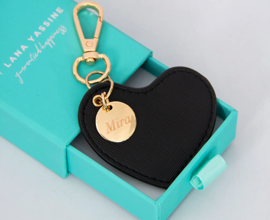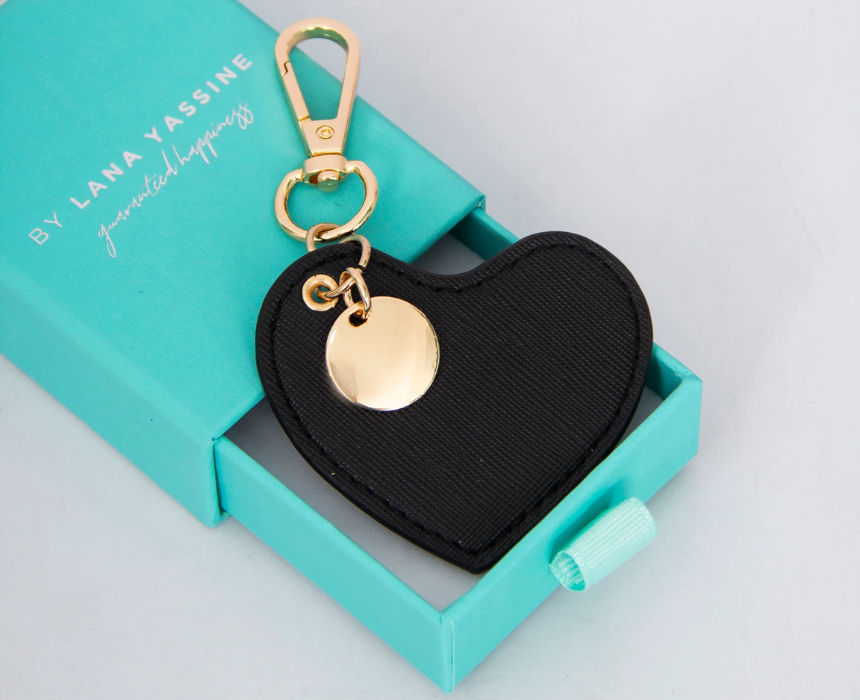 This black vegan leather heart keychain is a stylish and versatile accessory that brings a personal touch to your daily essentials. Arriving in a beautiful gift box, it features customizable engraving options on either the sleek leather heart or the durable round metal ring. This elegant piece can be styled by clipping it onto a black leather backpack for a monochromatic look or attached to a set of car keys to make them easy to find and uniquely yours.