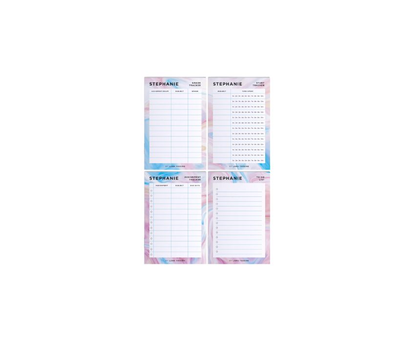 The Blue and Purple Marble Study Desk Planner is a captivating organizational set featuring four A6 note pads with fifty three tear off sheets each to streamline your academic workflow. This high quality stationery kit combines artistic stone patterns with practical functionality, allowing users to discard completed sheets once daily habits or tasks are achieved. To style this atmospheric set, place the pads on a white or glass desk for a clean look or use a silver clip to display your daily ripped sheets as an inspiring and colorful focal point on your study board.