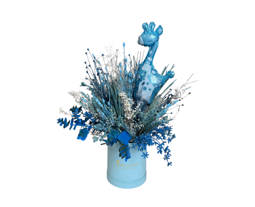 The Blue Baby Bliss Box is a 20×20 cm round floral box featuring an elegant mix of blue and white dried flowers, topped with a baby boy balloon stick. Perfect for celebrating a newborn, it makes a charming gift or decorative keepsake. Style it on tables, shelves, or as part of a baby shower display to create a festive and heartfelt presentation.