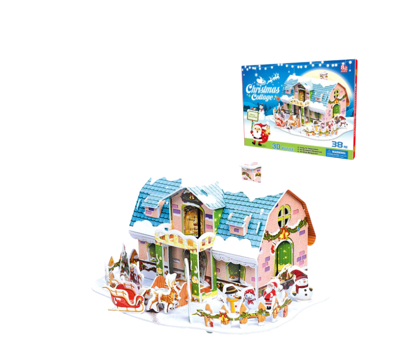 Blue Christmas Cottage 3D Puzzle is a festive buildable décor piece featuring a cozy winter cottage design accented in calming blue tones. It includes precision cut puzzle pieces that assemble into a sturdy three dimensional display perfect for holiday decorating. Style it on a mantel, shelf, or tabletop to add a cool toned seasonal accent to your Christmas décor.