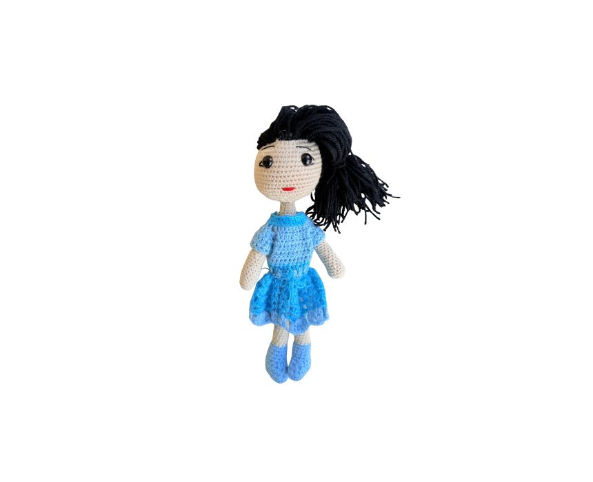 This hand-crocheted doll features calming blue hues, a charming side ponytail, and secure safety eyes, making it perfect for both cuddly play and a peaceful handmade décor accent. Its soft texture and soothing colors add a serene touch to any room or nursery. Ideal as a thoughtful gift or a cozy companion for children and collectors alike Designed for kids aged 3+
