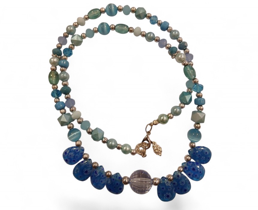 Make a sophisticated statement with the “Bluish N.,” a meticulously handcrafted long necklace. This piece features a rich composition of different-sized crystals, circular beads, and unique square beads, all balanced by polished silver separators. The design is anchored by original tear-shaped beads that add an elegant, fluid aesthetic to the silhouette. Each component is carefully selected to ensure a high-end artisan finish. Perfect for layering or as a standalone focal point. Durable and timeless jewelry.