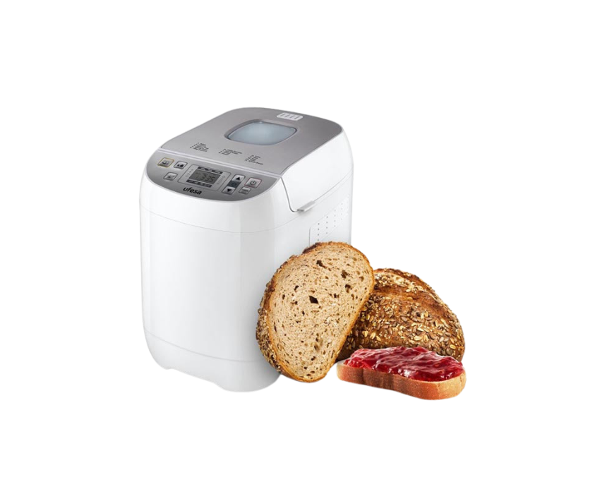 The Ufesa BM6000 Bread Maker features a 650W motor and 14 digital programs for bread, jam, and dough preparation. With adjustable loaf weights (500g, 750g, 1000g), three browning levels, a 1-hour keep-warm function, LCD display, and up to 15-hour delay timer, it makes homemade baking simple and precise. The detachable non-stick tank, cool-touch housing, and included accessories (cup, spoon, paddle hook) ensure easy use and cleanup.