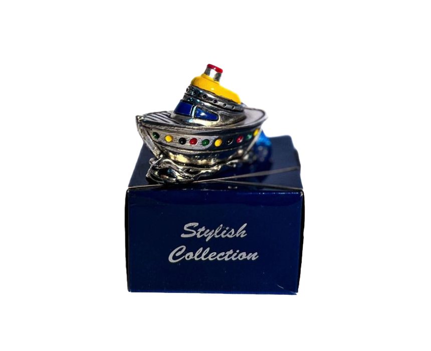 Celebrate nautical charm with this exquisite Boat Miniature Bibelot. Made in Italy, it features Silver ARG 925 plating and vibrant enameled colors that bring the design to life. Compact at 5×3.5 cm, this delicate piece is perfect as a decorative accent or a thoughtful gift. Its masterful craftsmanship and elegant details make it a timeless treasure.