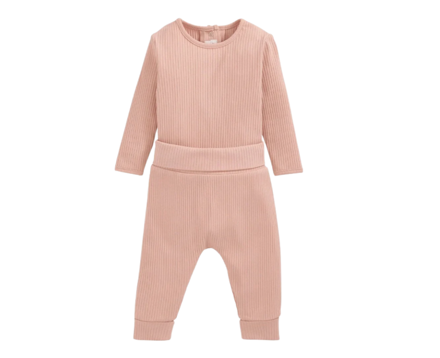 The Organic Ribbed Bodysuit & Bottoms Set in pink features soft, breathable organic cotton, designed for gentle comfort on delicate baby skin. This 2-piece set includes a long-sleeved ribbed bodysuit and matching bottoms with an elasticated waistband for easy dressing and all-day wear. Perfect for layering or wearing on its own, it provides a cozy, stylish, and practical outfit for newborns and toddlers.