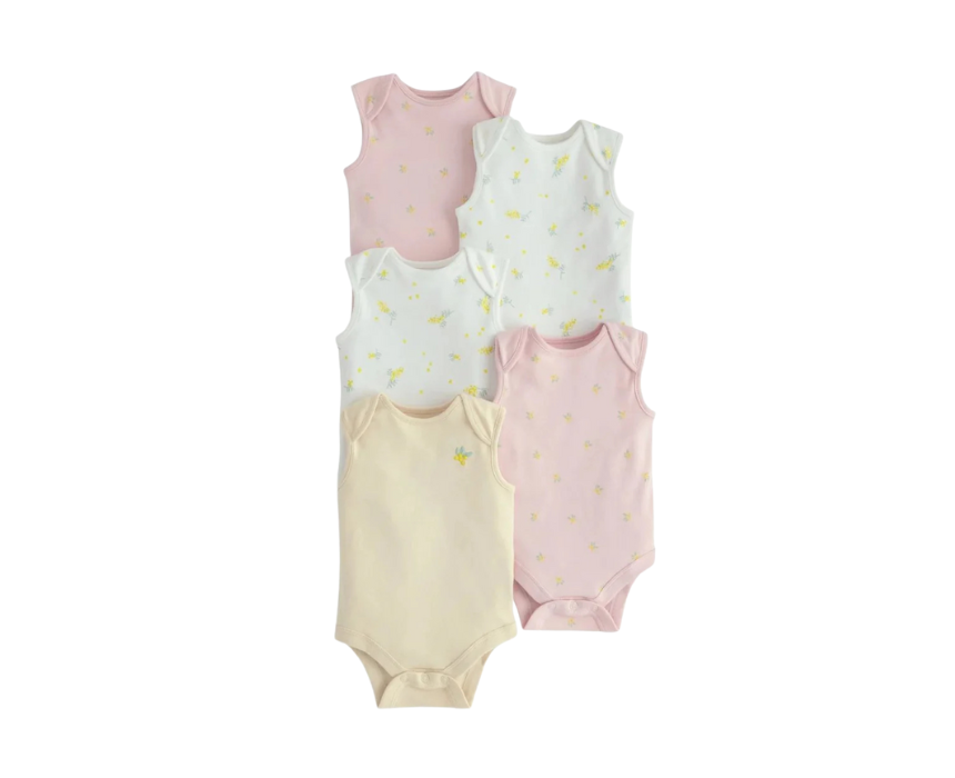 The Bodysuits Pack of 5 in Lemon Print includes five sleeveless cotton bodysuits in cheerful complementary colours, featuring two lemon prints, two plain sage green styles, and one with lemon placement embroidery. Made from 100% cotton with an envelope neck and easy crotch popper fastening, they are designed for everyday comfort and quick changes. Ideal worn alone in warm weather or layered under outfits for a fresh, playful look.