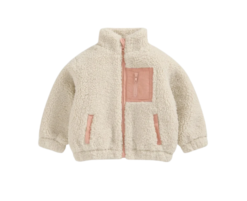 The Borg Jacket in beige is a cozy and stylish outer layer for babies and toddlers, crafted from soft, plush fabric to keep little ones warm. Featuring a relaxed fit and easy-to-use fastening, it is perfect for layering over everyday outfits or special occasion wear. Pair it with leggings, jeans, or a cute dress for a practical yet fashionable look.