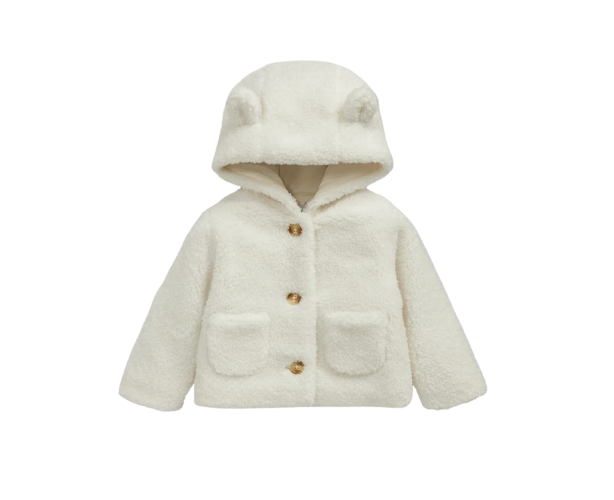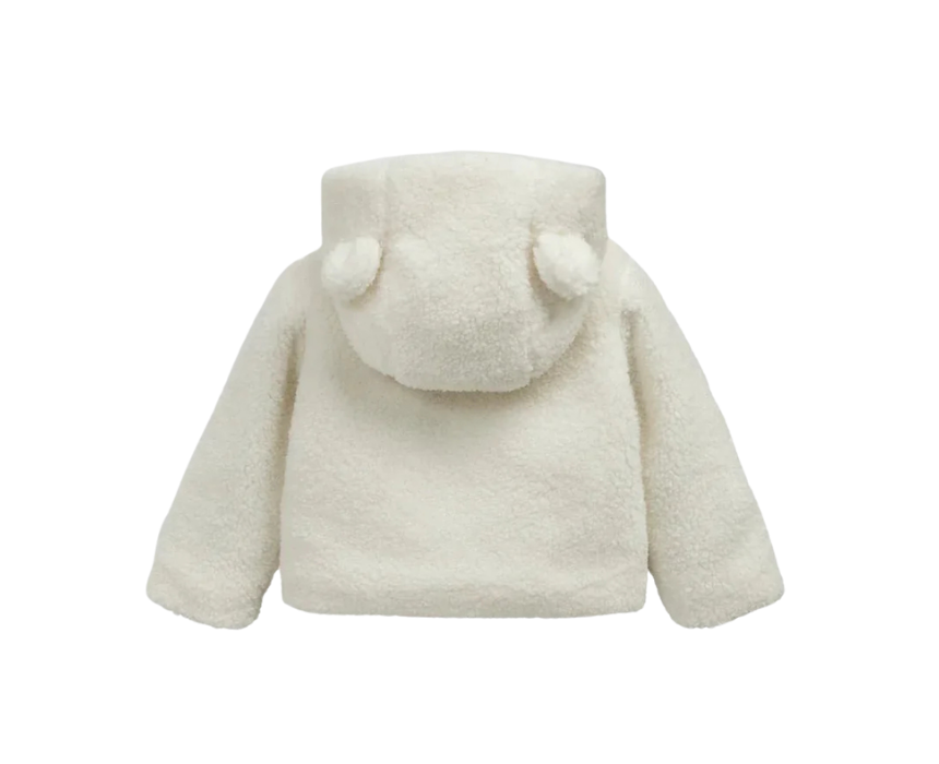 This cream borg jacket keeps little ones cosy and stylish with its soft, plush fabric and fully lined interior. Featuring a hood with 3D bear ear details, front patch pockets, and convenient button fastening, it’s perfect for chilly days. Ideal for layering over everyday outfits, this jacket adds warmth and a playful touch to any baby wardrobe.