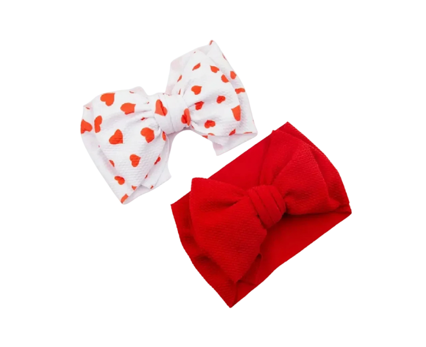 The Baby Girl Bow Headbands 2-Pack includes one bold red bow and one white headband with red heart prints, adding a sweet touch to any outfit. Made from soft, stretchy fabric, they ensure comfort for little ones while keeping hair neat. Perfect for everyday wear, Valentine’s Day, or special occasions, they complete adorable and festive looks.