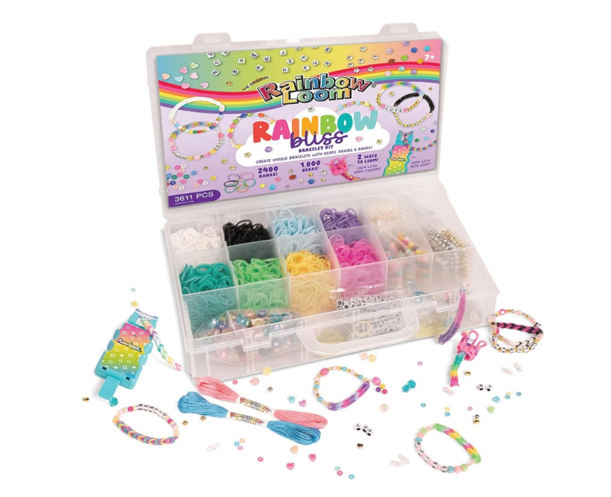 This braid and bead craft kit includes 2000 latex free bands, 390 beads, threads, needles, clasps, clips, and both auto and finger looms for versatile bracelet making. Designed for creative customization, it allows children to combine braiding and beading techniques in one set. Ideal for imaginative and hands on crafting activities.