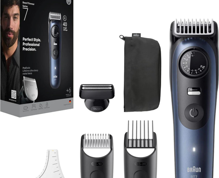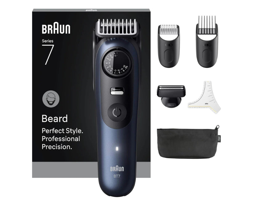 The Braun Beard Trimmer Series 7 BT7520 provides precise and versatile beard grooming with adjustable length settings and sharp, durable blades. Its ergonomic design ensures comfortable handling, while the sleek finish adds a modern touch to any bathroom. Ideal for daily use, it delivers clean, well-defined trims and styling for a polished, professional look.