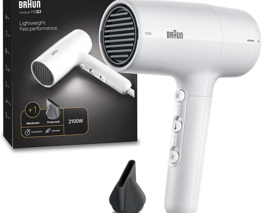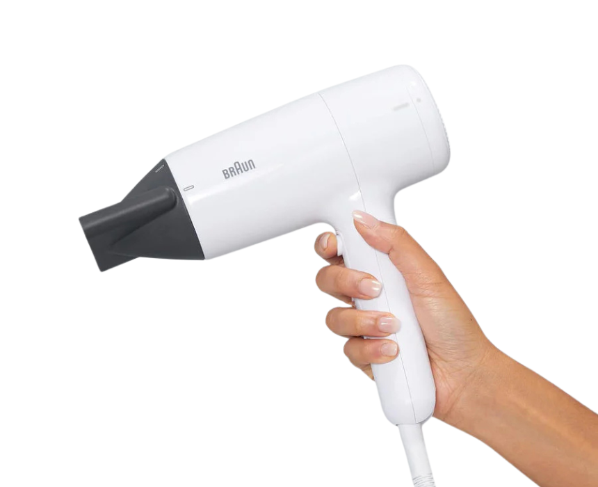 The Braun BRHD210SDE DC Hair Dryer in white delivers 2100W of powerful airflow for fast, efficient drying and styling. Its lightweight design and multiple heat settings allow precise control for sleek, smooth looks or voluminous styles, making it ideal for everyday use at home or on the go.