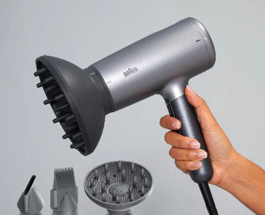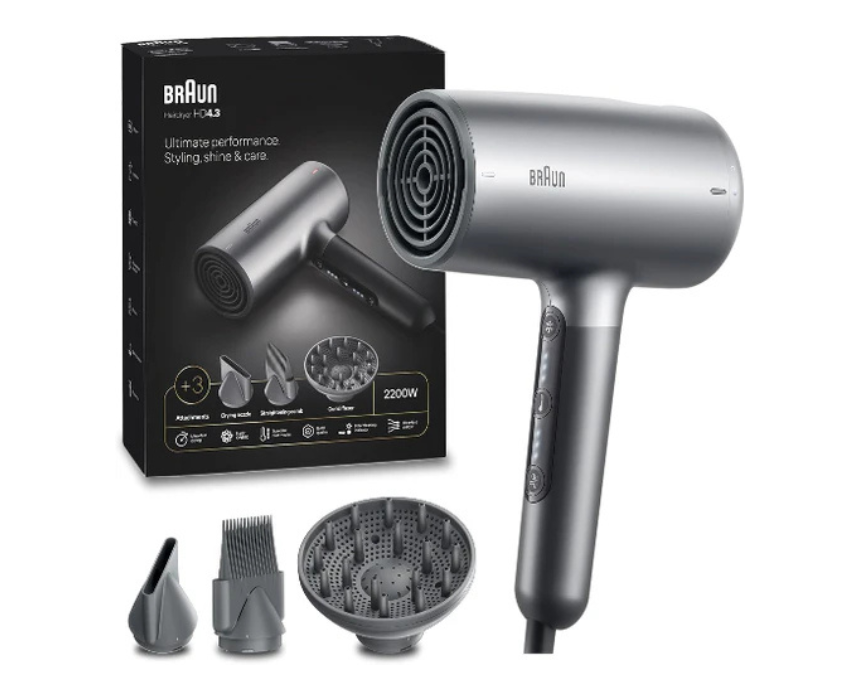 The Braun BRHD435SDE DC Hair Dryer in electronic grey delivers 2200W of powerful airflow for fast, efficient drying and styling. Its advanced electronic controls, lightweight design, and multiple heat and speed settings allow users to create sleek, smooth looks or voluminous styles, making it ideal for daily home use or professional-quality results.