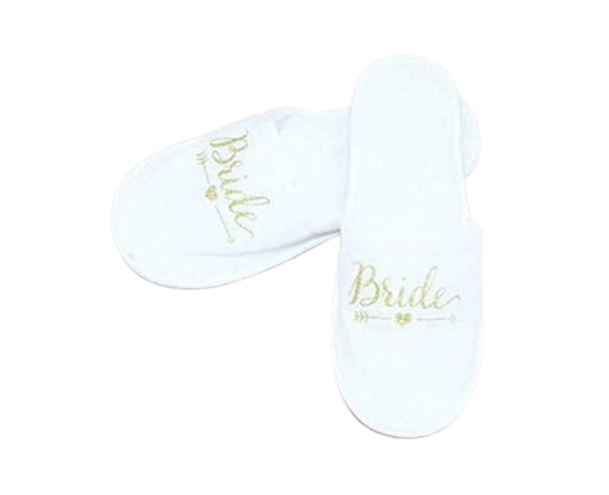 The Bride Slippers are comfortable and elegant footwear designed for brides, fitting sizes 34 to 41. Perfect for wearing while getting ready on the wedding day, they combine style and practicality. Style them during hair and makeup sessions, bridal photos, or as a cozy keepsake for the bride.