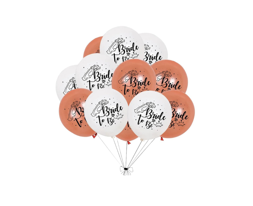 Bride to Be Balloons Set includes 12 latex balloons featuring six white and six beige Bride to Be designs for a chic and coordinated celebration. Perfect for bridal showers bachelorette parties or engagement events these balloons can be styled together as a backdrop or scattered around the venue for an elegant festive look.