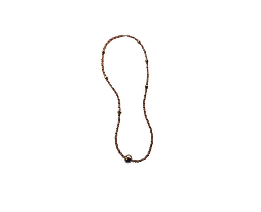 Medium necklace featuring a golden shiny ball pendant, small brown pearls, golden bulletins, and golden shiny balls. A versatile and stylish accessory that complements any outfit.