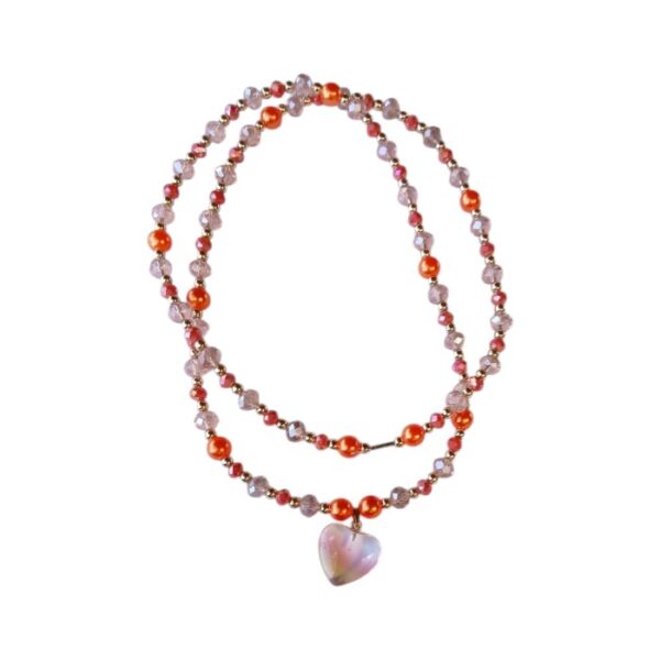 The “BO” is a medium-length handmade necklace that blends brown, beige, and light pink crystals with polished silver separators. It features a unique heart-shaped white and orange pendant that adds a playful and modern focal point. The mix of soft pinks and earthy browns creates a balanced color story suitable for all seasons. This lightweight accessory is perfect for daily wear, providing a subtle artistic touch to your favorite casual outfits.