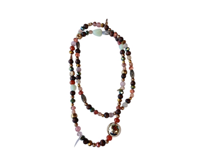This long handmade necklace features a rich “Brownish Combination” of wooden beads and various other textures. Accented with pearls, a big golden ball, and silver separators, it offers a sophisticated take on bohemian style. The mix of wood and metal elements provides a balanced weight and a unique visual appeal. Perfect for layering over sweaters or simple tees, this artisan-crafted piece brings a touch of organic warmth to your seasonal style.