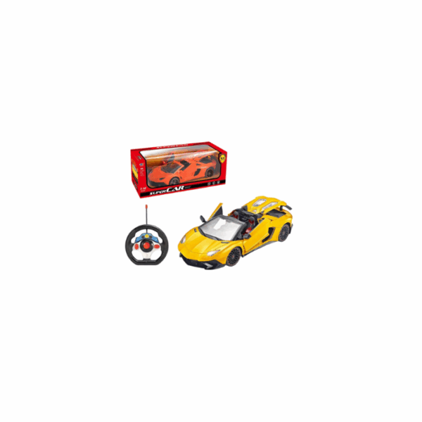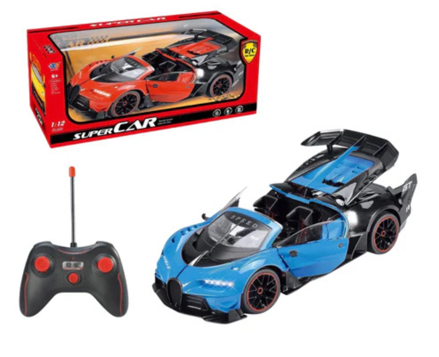 This 1:12 scale remote-controlled supercar is inspired by a Bugatti and offers full-function driving forward, backward, and side to side. It features remote-controlled opening doors, comes in multiple color options, and runs on a rechargeable car battery with AA batteries for the remote. It can be styled on a play surface or display shelf, perfect for racing, collection, or realistic driving fun.
