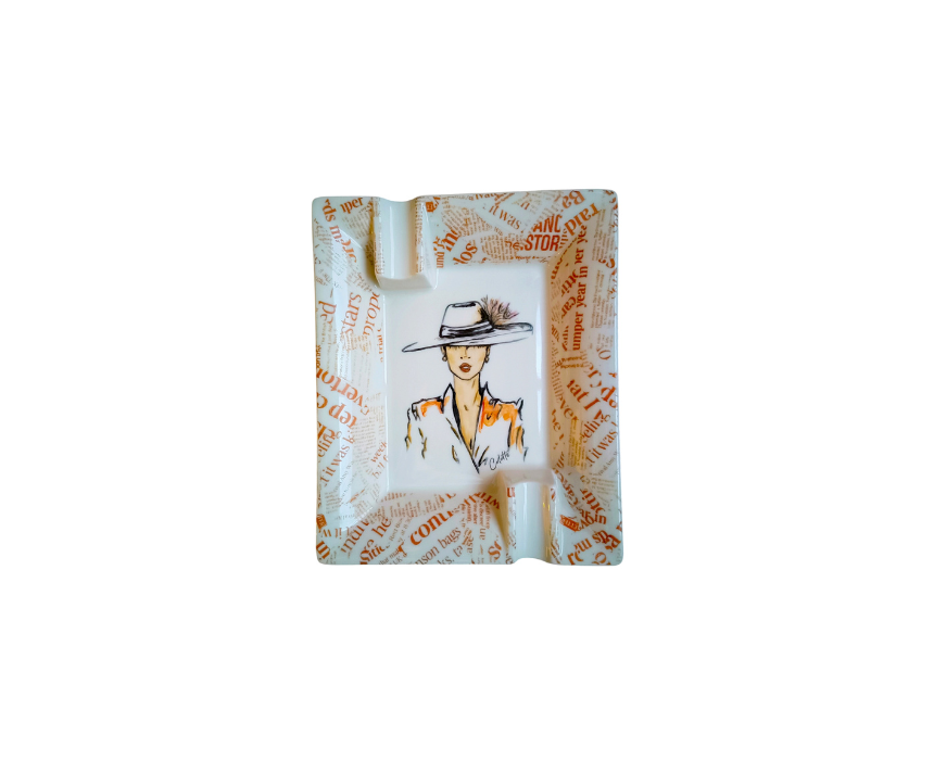 This hand-painted cigar ashtray features a stylish business woman design in vibrant orange, crafted from high-quality porcelain with permanent colors for long-lasting elegance. Perfect for desks, home offices, or lounge areas, it adds a sophisticated touch to any space while keeping surfaces clean. Its compact size makes it ideal for personal use or as a thoughtful gift for cigar enthusiasts and collectors.