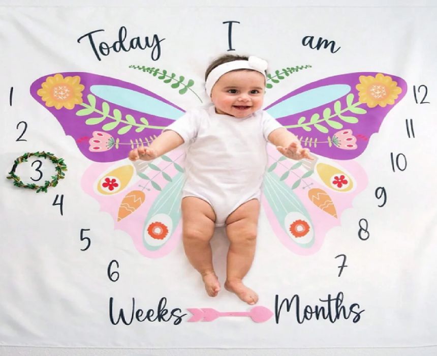 This butterfly-themed milestone blanket offers a soft and cozy fleece texture, perfect for capturing newborn monthly growth from day one to twelve months. Featuring a delicate pastel butterfly design, it provides a gentle, stylish backdrop ideal for photoshoots, baby showers, and keepsake memories. Use it to create beautiful milestone pictures that celebrate your baby’s first year.