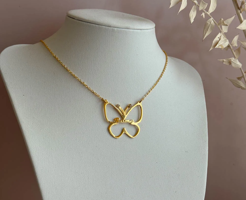 A personalized necklace featuring a delicate butterfly design paired with a custom name for a graceful and meaningful look. This stylish piece adds a touch of individuality and charm to everyday outfits while complementing both casual and dressy styles. It can be worn alone for a subtle statement or layered with other necklaces to create a trendy personalized jewelry stack.